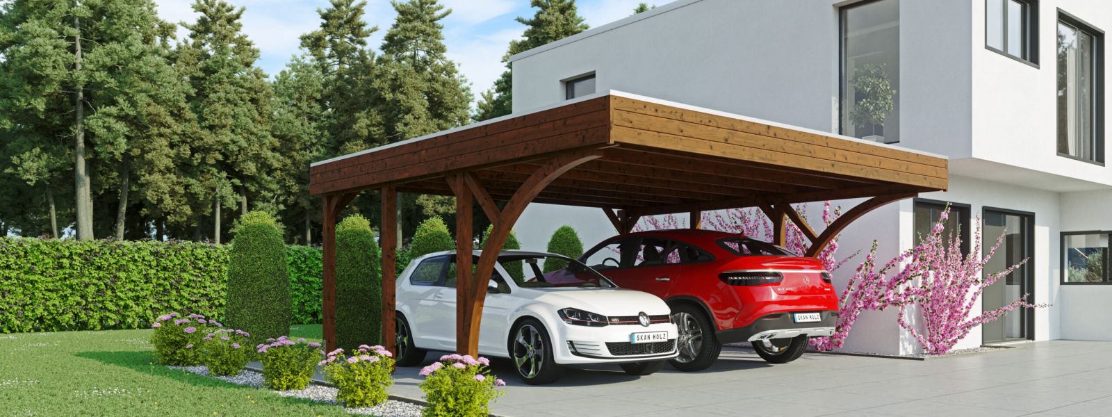 Für jeden Zweck und Geschmack finden Sie bei SKAN HOLZ die richtige Lösung – sei es ein praktisches Gartengerätehaus für Rasenmäher, Heckenschere & Co., ein raffiniert designter Wetterschutz für Ihren Wagen als offenes Carport oder sogar als verschließbare Holzgarage oder Pavillons und Terrassenüberdachungen, die Ihnen viel Freiraum zum Entspannen direkt in der Natur ermöglichen.